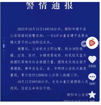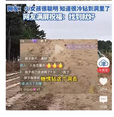 辽宁4岁女孩失踪找到了…… 辽宁的4岁女孩,失踪40多个小时,在沟里一个洞里找到,雨也没淋到她,避免了失温。 搜救犬在马路边上走来走去不肯前进,后来又在马路边上坐下不肯动,经过进一步排查,搜救队员发现它们在马路边上的树林里有异样气味,深入查找发现了小女孩。 小女孩很聪明,不知道怎么回家躲在了一个山洞里,小女孩的父母都是当地的农民工,在北京打工,他们特别听话,给父母减轻了不少负担,这次搜救队员和村民们不顾自己安全,日夜不停地搜寻孩子40多个小时。在寒风刺骨的天气中,他们吃住在车里、野外、山坡上,用尽了所有办法找孩子。这是东北人对孩子的重视,对家庭的重视,对孩子父母的尊重,这是东北人团结一致,不怕苦,不怕累,不怕危险的精神。 小女孩找到后,网友们都表示庆祝,这是多灾多难的一年,希望孩子平平安安,这是给所有父母最大的安慰。