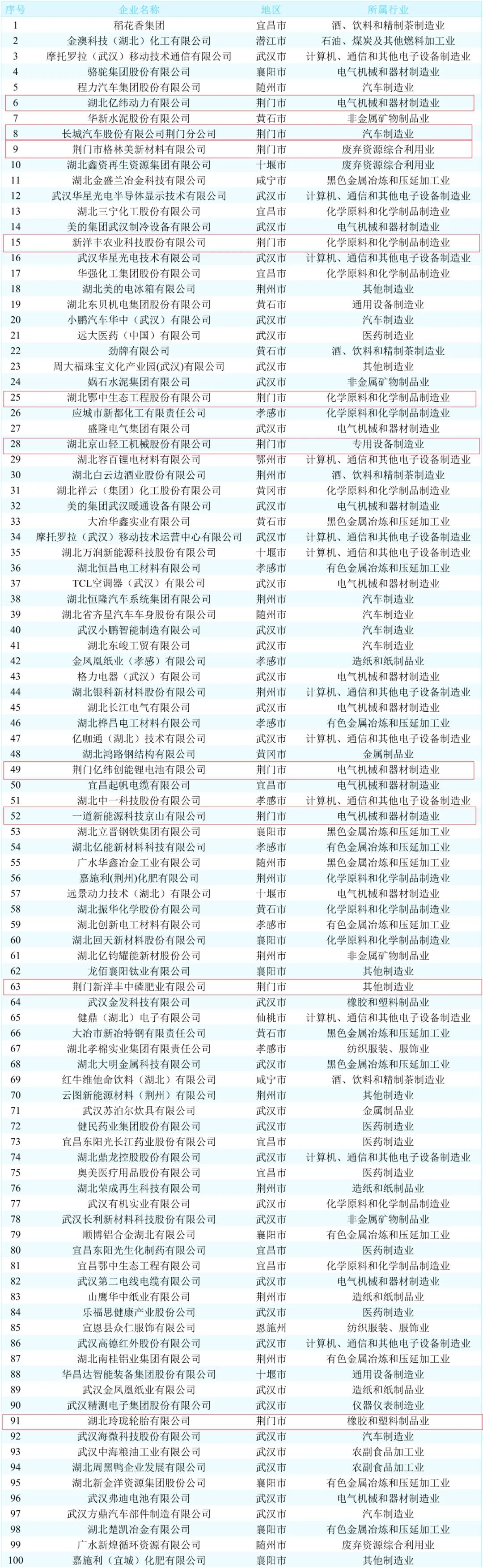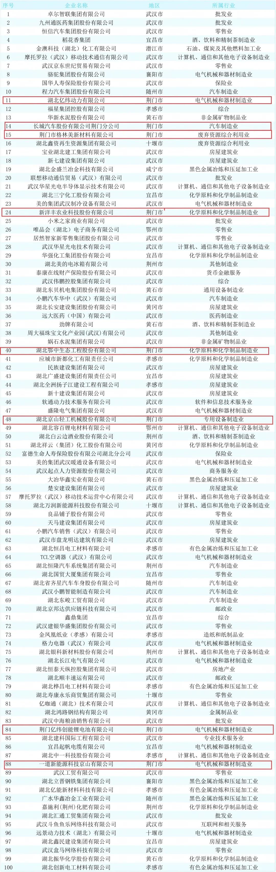 近日,省工商联发布2025湖北民营企业100强系列榜单,这是我省连续15年发布民企百强榜单。荆门8家企业上榜“2025湖北民营企业100强”,10家企业上榜“2025湖北民营企业制造业100强”,1家企业上榜“2025湖北民营企业服务业100强”。