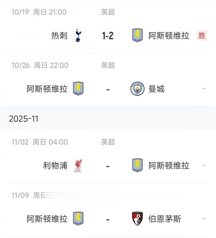 维拉摆脱了赛季初的低迷之后,现在正是状态火热之时。接下来维拉将在欧联杯对阵弱旅前进之鹰和特拉维夫马卡比,不过他们这期间的三轮英超,将挑战积分榜的2/3/4名:曼城、利物浦和伯恩茅斯。