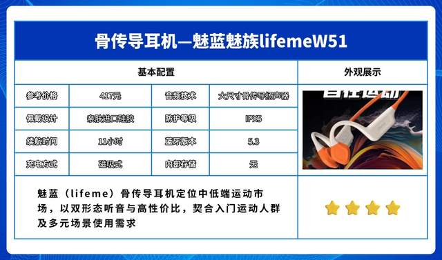 魅蓝(lifeme)骨传导耳机定位中低端运动市场,以双形态听音与高性价比,契合入门运动人群及多元场景使用需求。