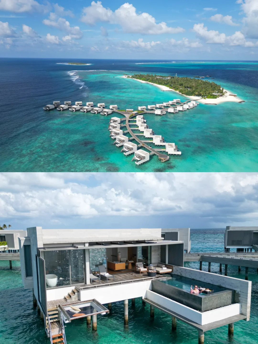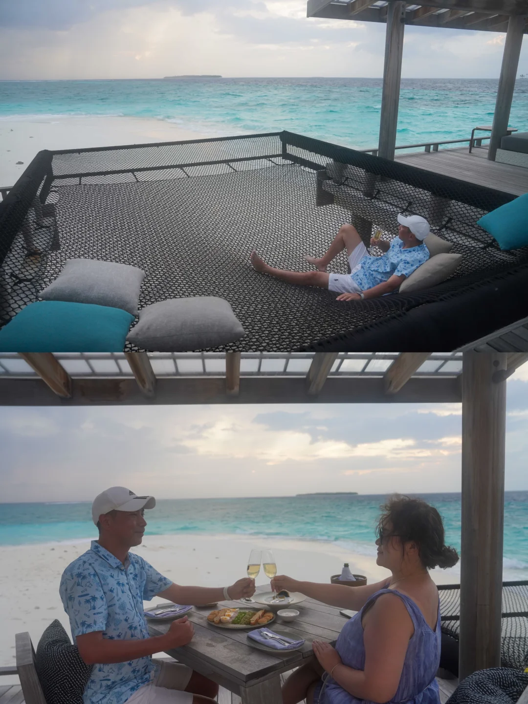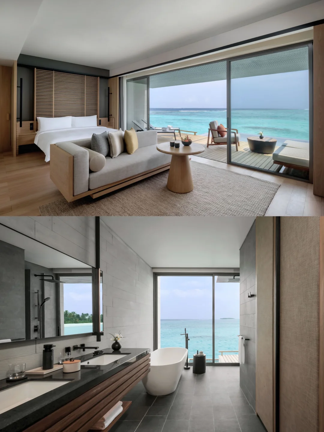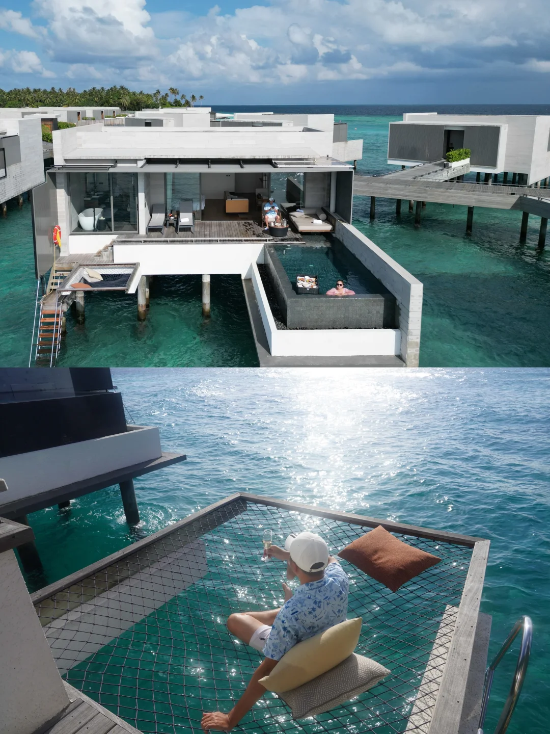 很多人第一眼就被“水屋”吸引——私人泳池、阳光甲板、推门即海,白天能直接跳进蔚蓝泻湖浮潜,夜晚泡在泳池看星星,浪漫得不真实。