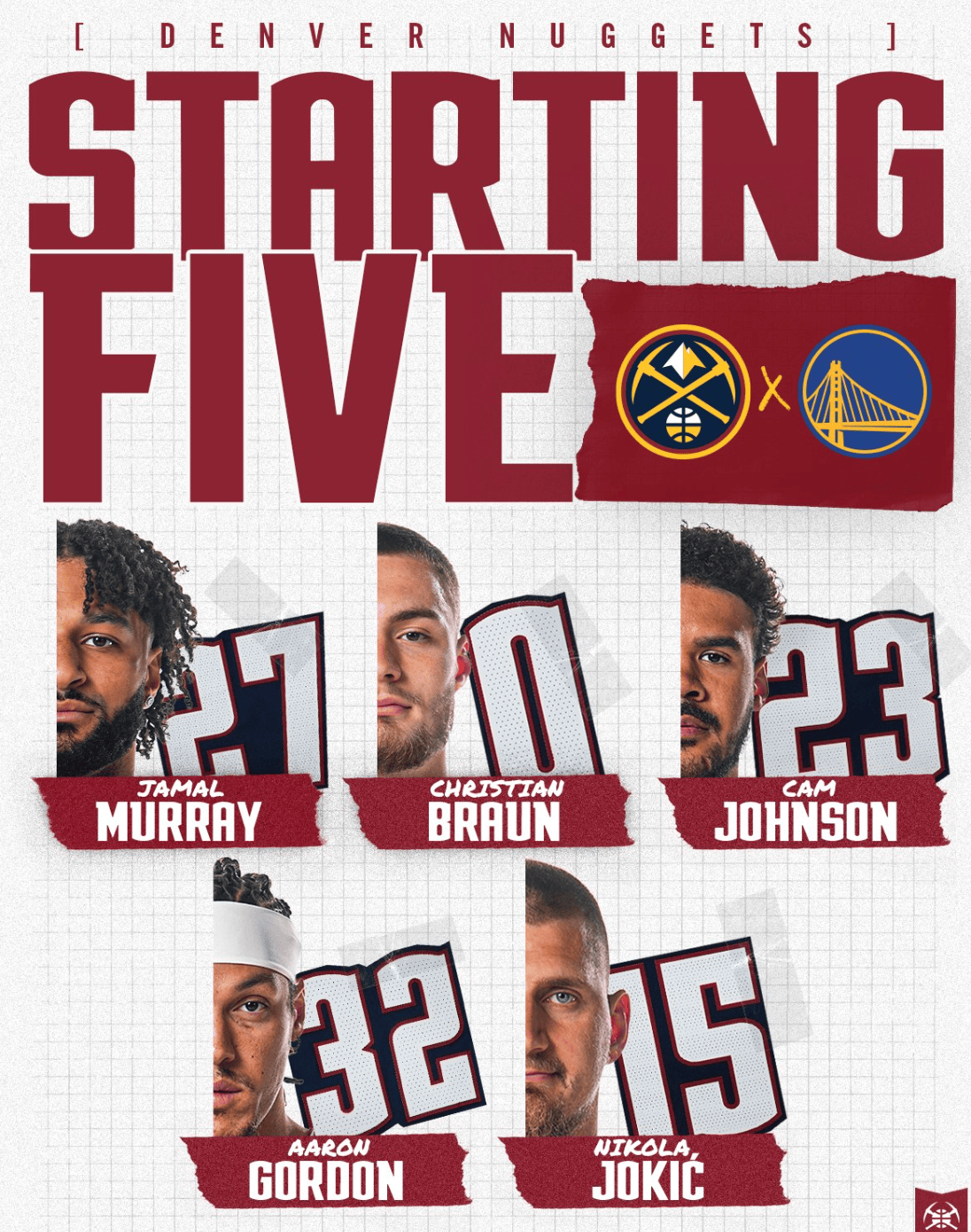 赛前,掘金公布球队本场首发阵容:贾马尔-默里、克里斯蒂安-布劳恩、卡梅伦-约翰逊、阿龙-戈登和尼古拉-约基奇。