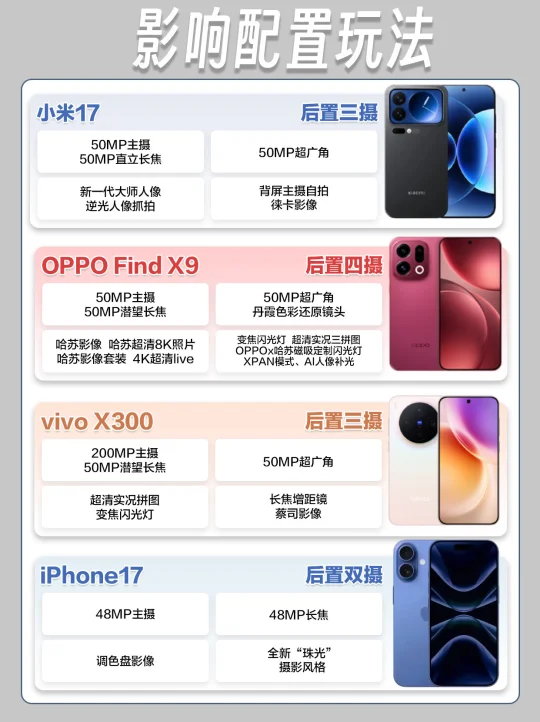 今年下半年各大厂都出了自己的旗舰机,分别有OPPO Find X9 ,小米17,vivo X300以及iPhone17!哪家更值得买呢?一文带你看清楚~