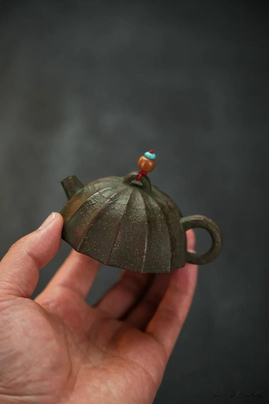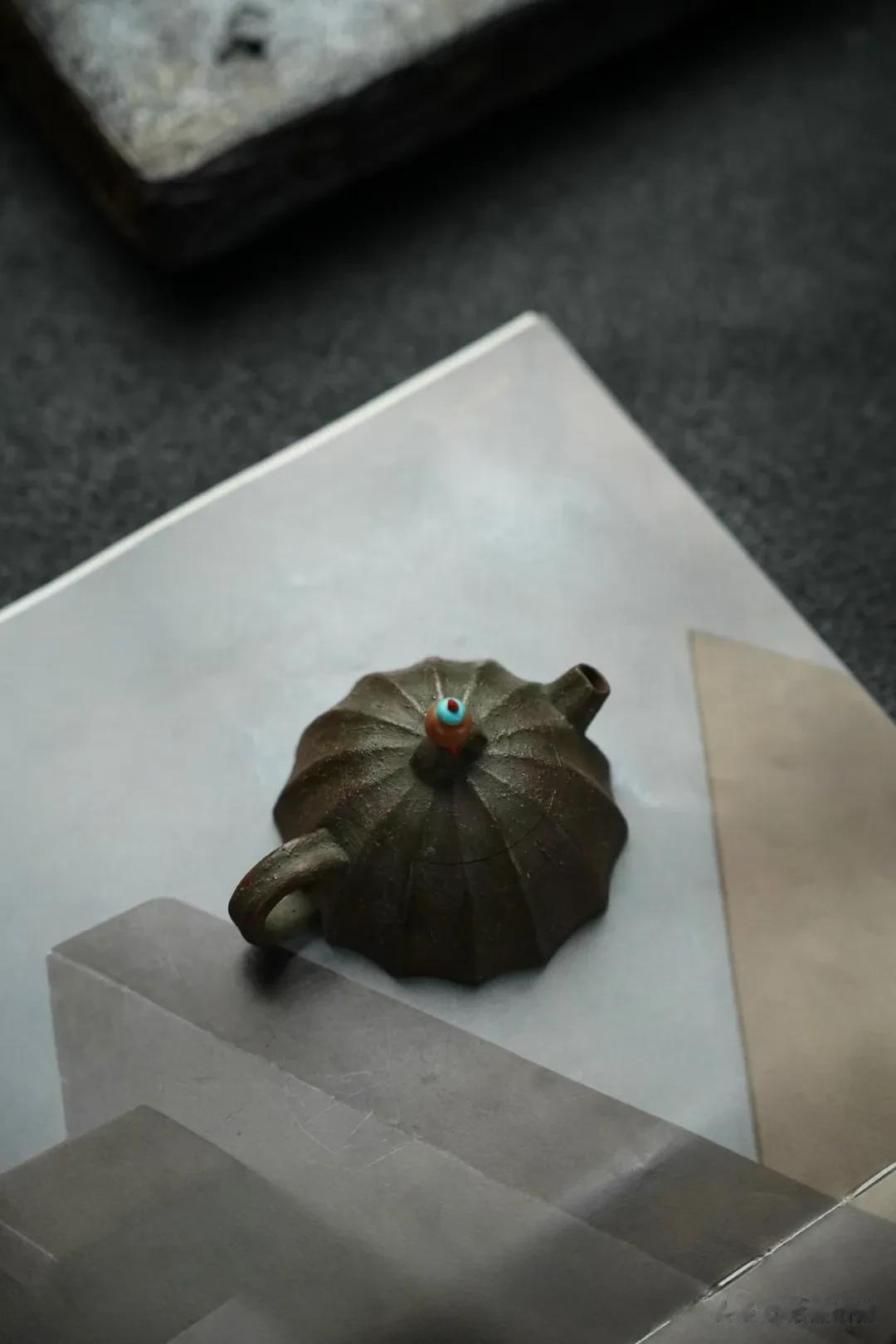 其质,承袭“紫砂双色”的古老智慧。内胎是醇厚的老紫泥,经年陈腐,泥性稳顺,如长者般善于容纳与调和,能慢慢养出茶汤的醇度与香气。外衣是雅致的墨绿泥粉浆,色如远山青黛,清冷幽深。两种泥料,一内一外,一暖一冷,一养味一悦目,在功能与审美上交相辉映。所谓“上手把玩效果出彩”,正是这胎体与粉浆,在与手掌经年累月的摩挲、茶汤朝夕不辍的滋润中,悄然蜕变。墨绿之色会愈发温润,泛出幽光,老紫泥的内蕴亦会透过浆层,隐约呈现。壶,因而有了生命的痕迹,记录着每一次倾注与停驻。