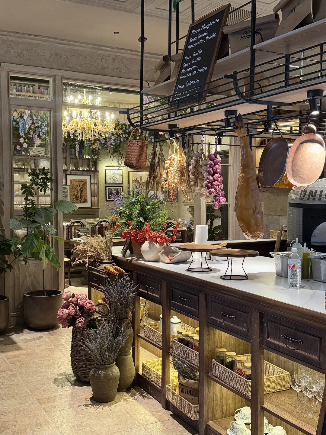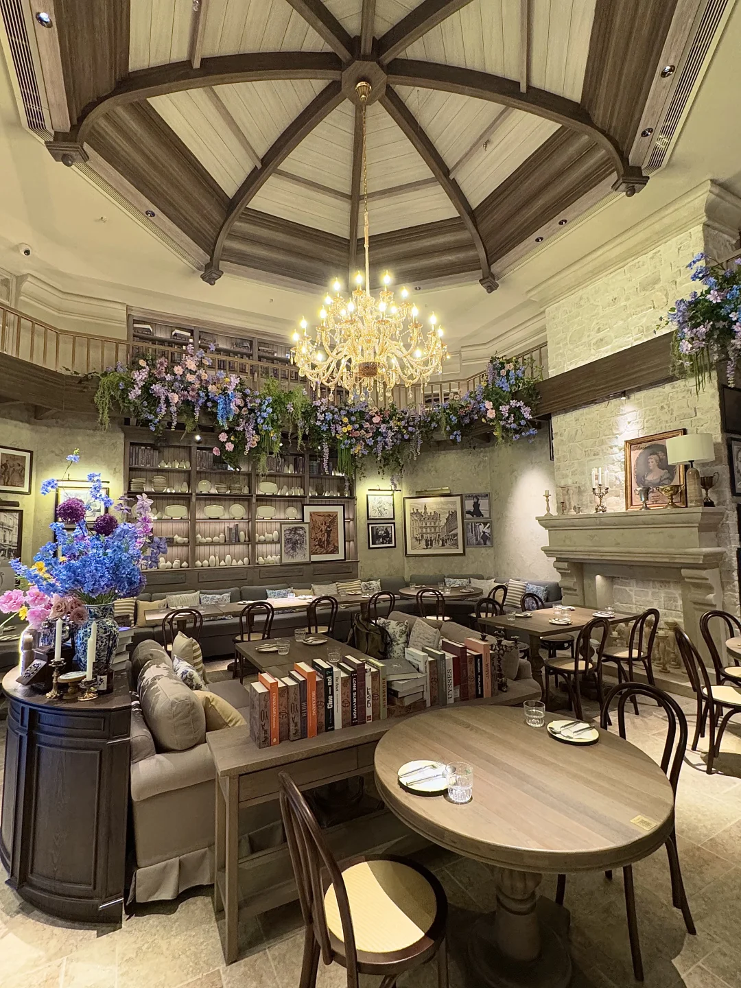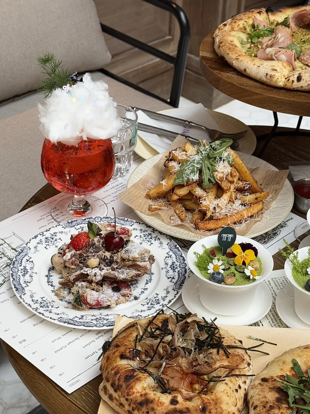 深业上城新开的!漂亮的餐厅➕1 南法复古风的装修太美了!! 随手一拍都是氛围感,水晶灯、壁画、壁炉… 用餐氛围好浪漫啊啊啊~姐妹小聚or约会都很适合! 点了🍰XXXXL法式车厘子蛋糕🍕、罗勒开心果火腿披萨🍕、MINI窑烤披萨拼盘、🍵抹茶草莓莫奈花园…都吼吼吃!! 预计会爆火。。。。。。。