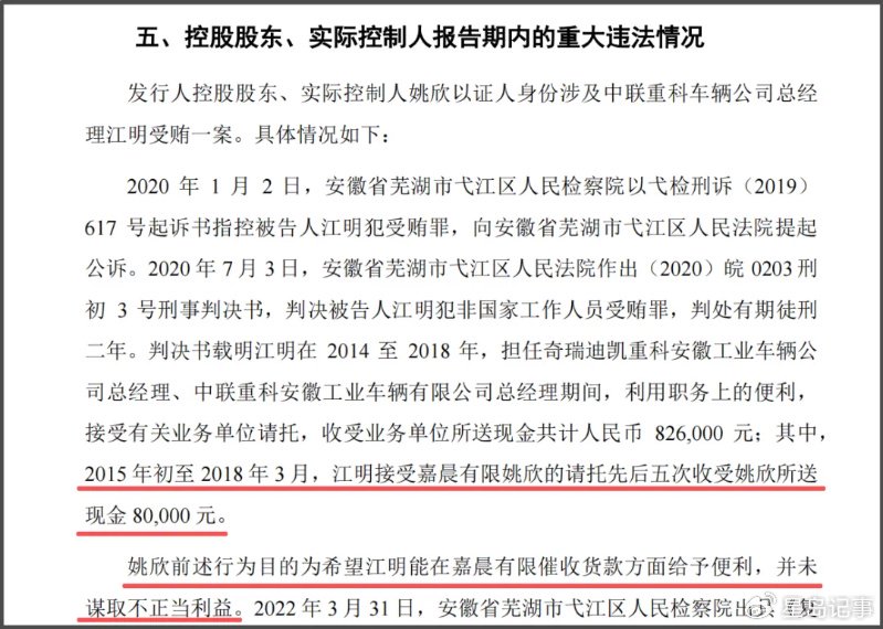 值得注意的是,在嘉晨智能2022年冲击科创板期间,公司实控人姚欣曾涉及行贿的案件被公开披露。