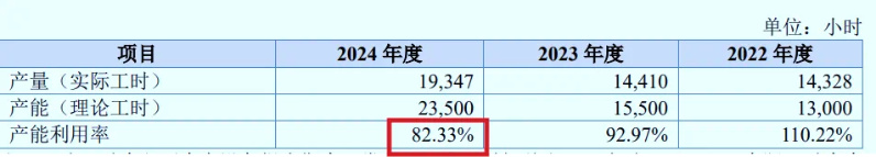 值得注意的是,嘉晨智能此次新建生产基地的核心目的是扩大产能,但公司近年产能利用率却呈逐年下滑趋势:2022—2024年,嘉晨智能产能利用率分别为110.22%、92.97%、82.33%。