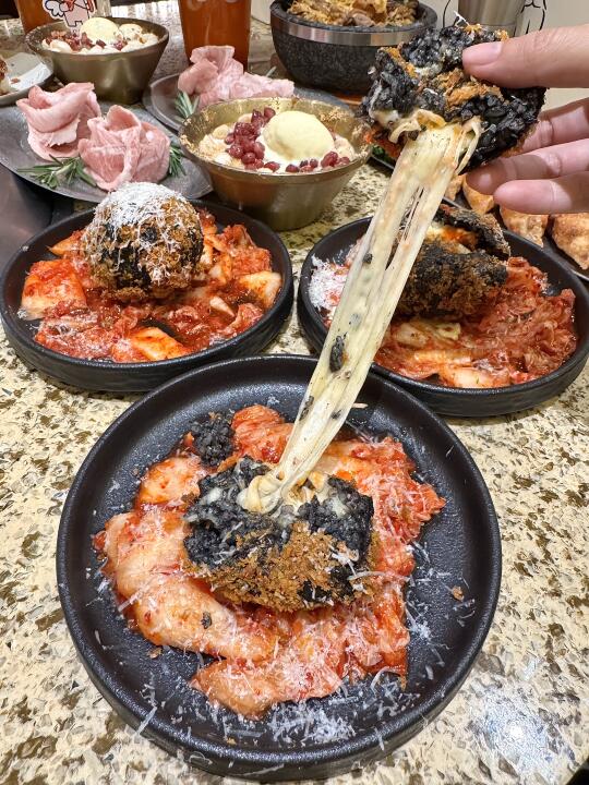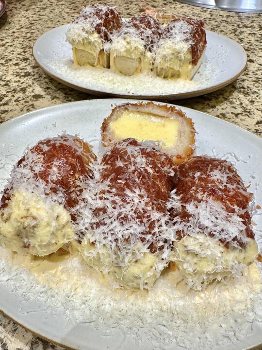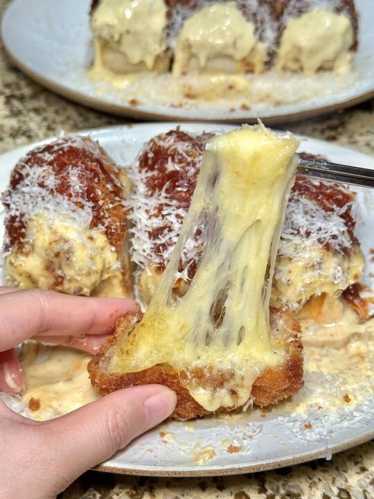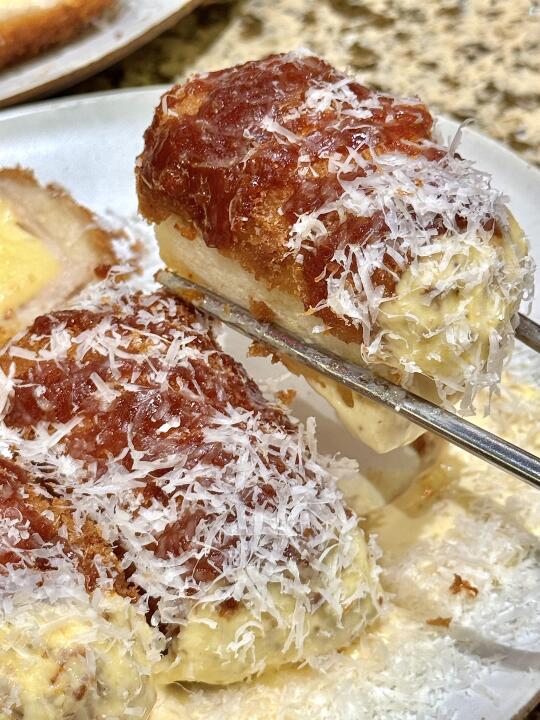 这一口乳酪芝士炸猪排!吃完我回味了三天!! 猪排炸的很酥脆!中间夹层一大块奶酪芝士,入口奶香奶香还拉丝~ 真的好好吃啊啊啊啊!😭😭