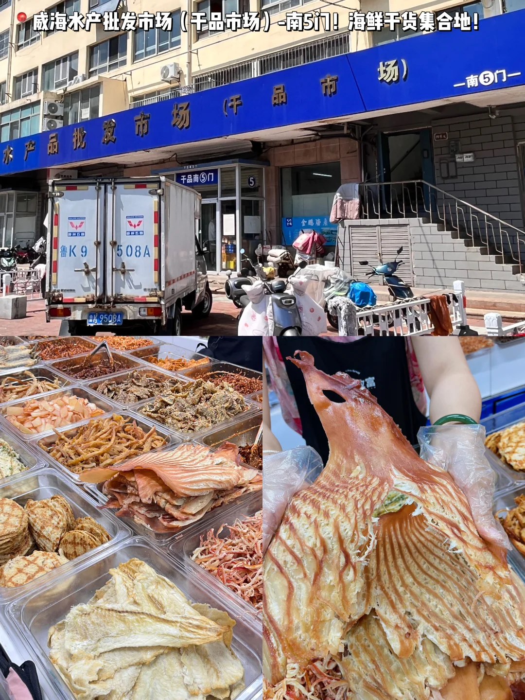 ✅买了新鲜的海鲜后,一定冲隔壁的干品市场(南5门)!海鲜干货都是威海本地特色,从南5门进去敲多的海鲜干货等着你!本人醉爱的麻麻辣辣鳗鱼丝、咸香的鱿鱼丝一定要买!我常逛店就在图5,价格公道,品质有保障,姐妹们冲啊~