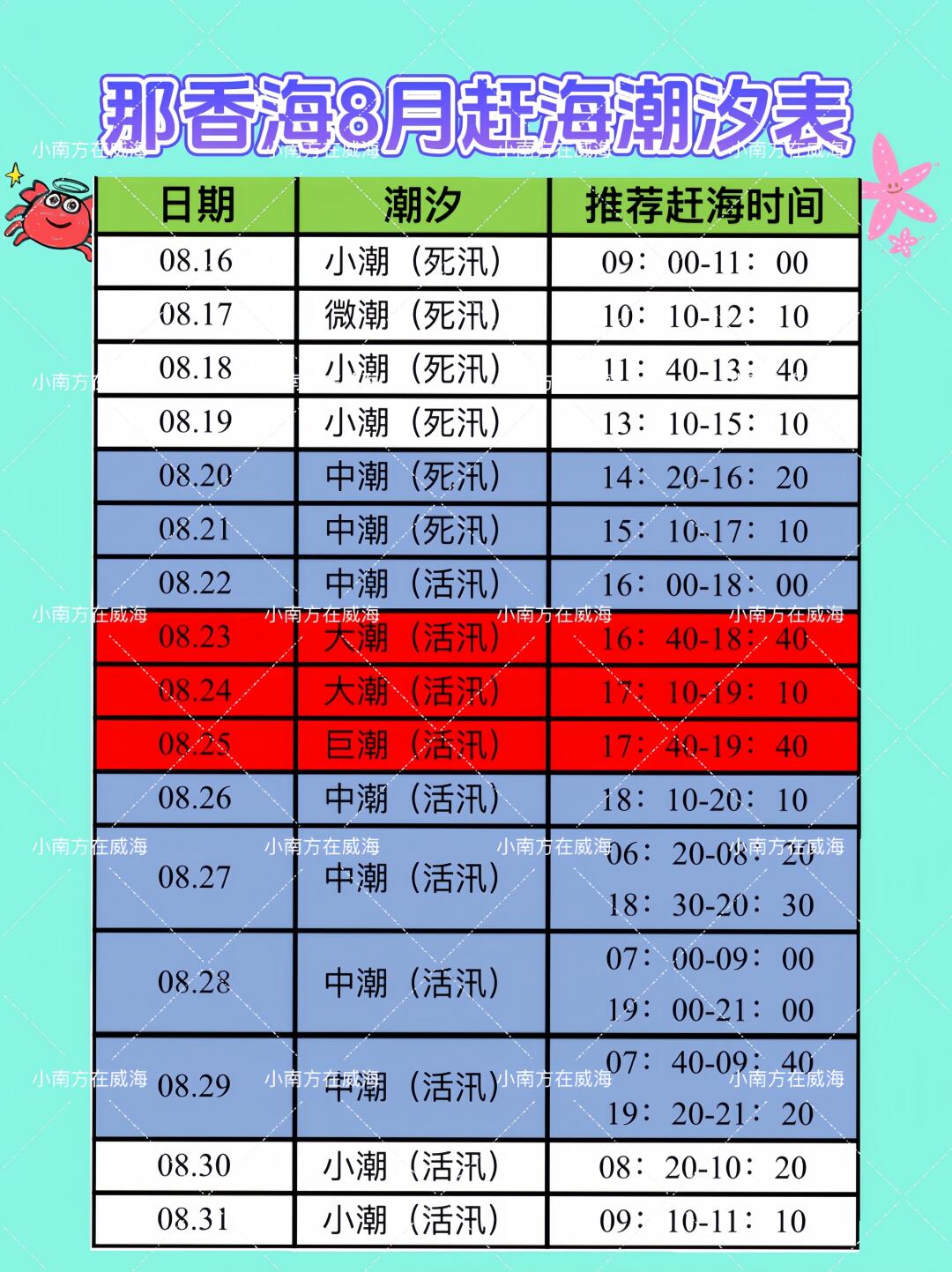 图2整理了那香海8月的赶海潮汐表,姐妹们就按表格内的时间去!23、24、25号都是大潮,冲啊!
