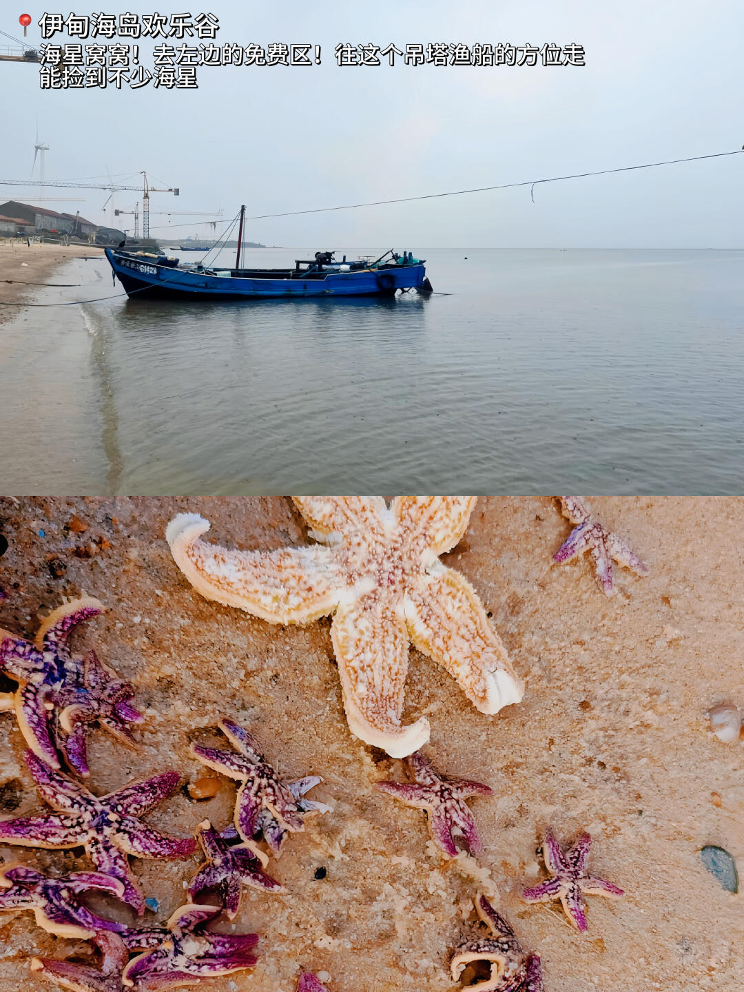 在鸡鸣岛附近,是野海滩,左边是免费区!右边是收费区!直接往左手边走,走到吊塔有渔船的地方,有很多海星可以捡!