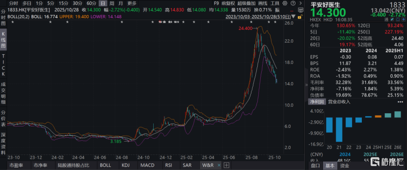 根据WIND数据,在过去两年间,随着平安好医生实现业绩扭亏为盈、完成品牌战略焕新等一系列利好兑现,其市值经历了一轮显著的上升周期。特别是在今年6月品牌升级后,股价一度强势上攻至24.4港元的高点,技术层面当时已进入超买区间,运行于布林通道上轨之上。随后的回调,可视为市场自然的获利了结与估值消化过程,当前股价已回落至布林通道下轨附近,技术压力得到有效释放。