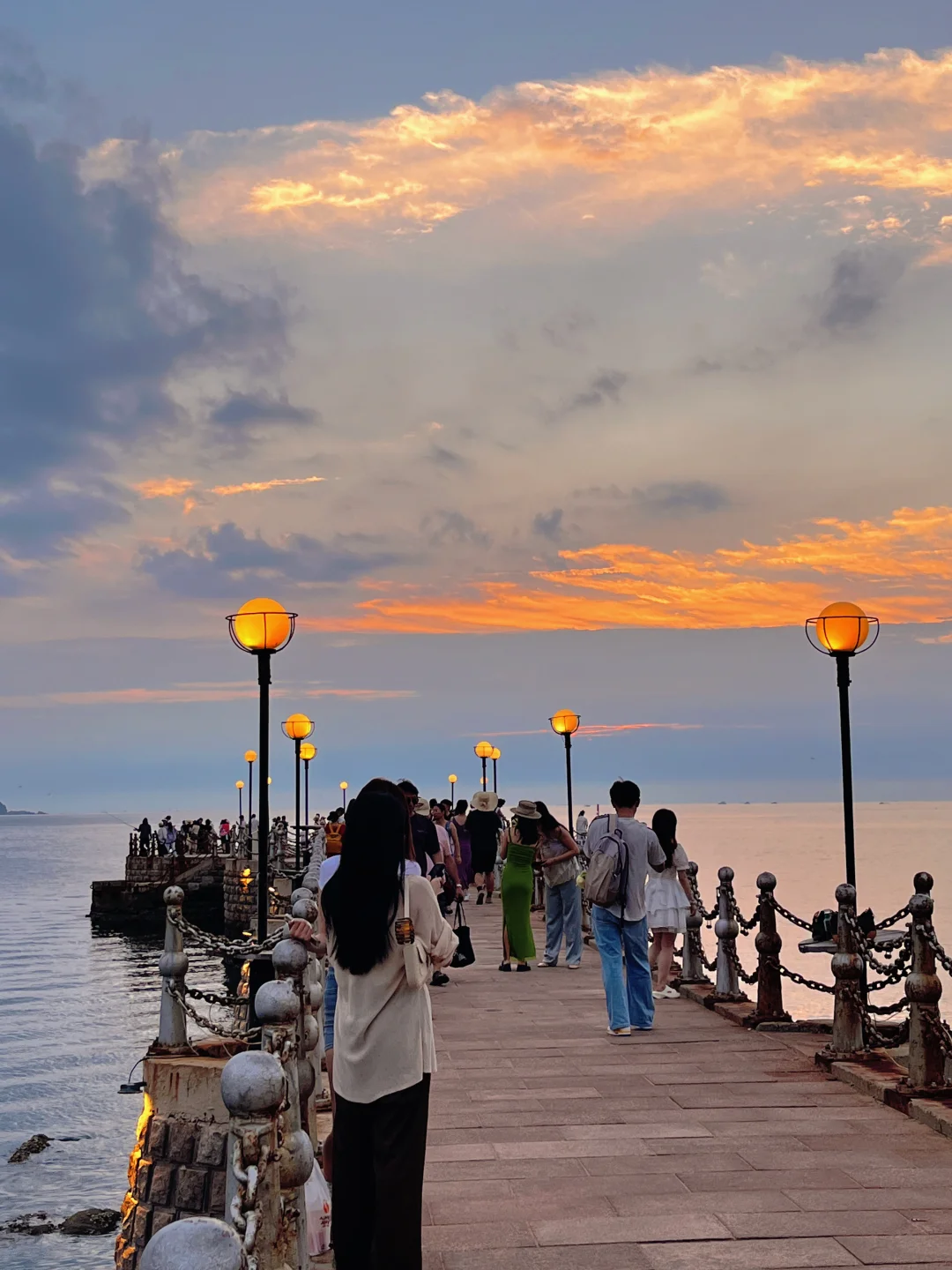 姐妹们!来威海旅行真的每天都要去看日落! 除了海边🌅日落,栈桥🌉日落也一定一定要看! 📍金海湾栈桥 一定提前1小时到达,日落前的半小时就开始有暖调☀️光晕真的好美! 栈桥上面有很多很多出片点,这里必定会拍出人生照片! 而且!就算太阳躲进云层也不要灰心!图1太阳进去了一半画面是暖色调,图2太阳躲进去以后画面变成蓝粉色了!拍照的我都被惊艳到了! 威海海边的日落真的好美!姐妹们冲!