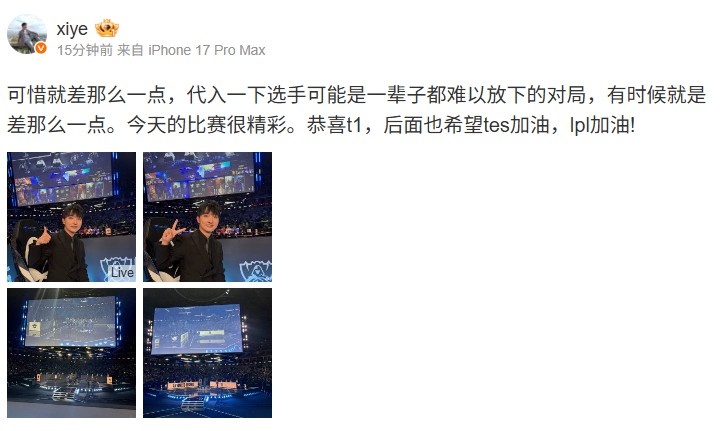 可惜就差那么一点,代入一下选手可能是一辈子都难以放下的对局,有时候就是差那么一点。今天的比赛很精彩。恭喜t1,后面也希望tes加油,lpl加油!