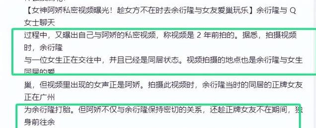 据曝料称,阿娇与余衍隆交往期间,余衍隆有一个稳定的女友,且还曾为其打胎,这样的关系也就有了所谓的“知三当三”的形容。