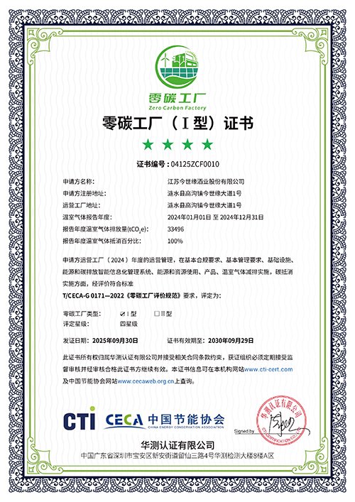 日前,今世缘酒业凭借在绿色低碳领域的卓越表现,成功通过中国节能协会零碳工厂认证,荣获零碳工厂(Ⅰ型)四星级证书,成为白酒行业首批获此殊荣的企业之一。