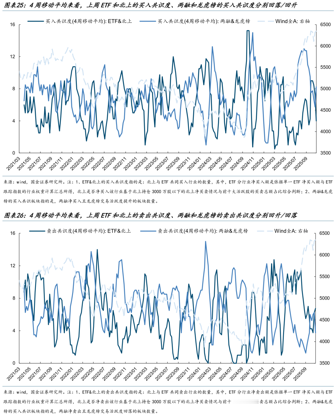 参与者共识高频跟踪:ETF和北上的买入共识度继续回落,而两融和龙虎榜的买入共识度有所回升。这意味着各类参与者大多不同程度回流,但整体分歧在加大,后续关注市场买入共识度能否逐步回升。