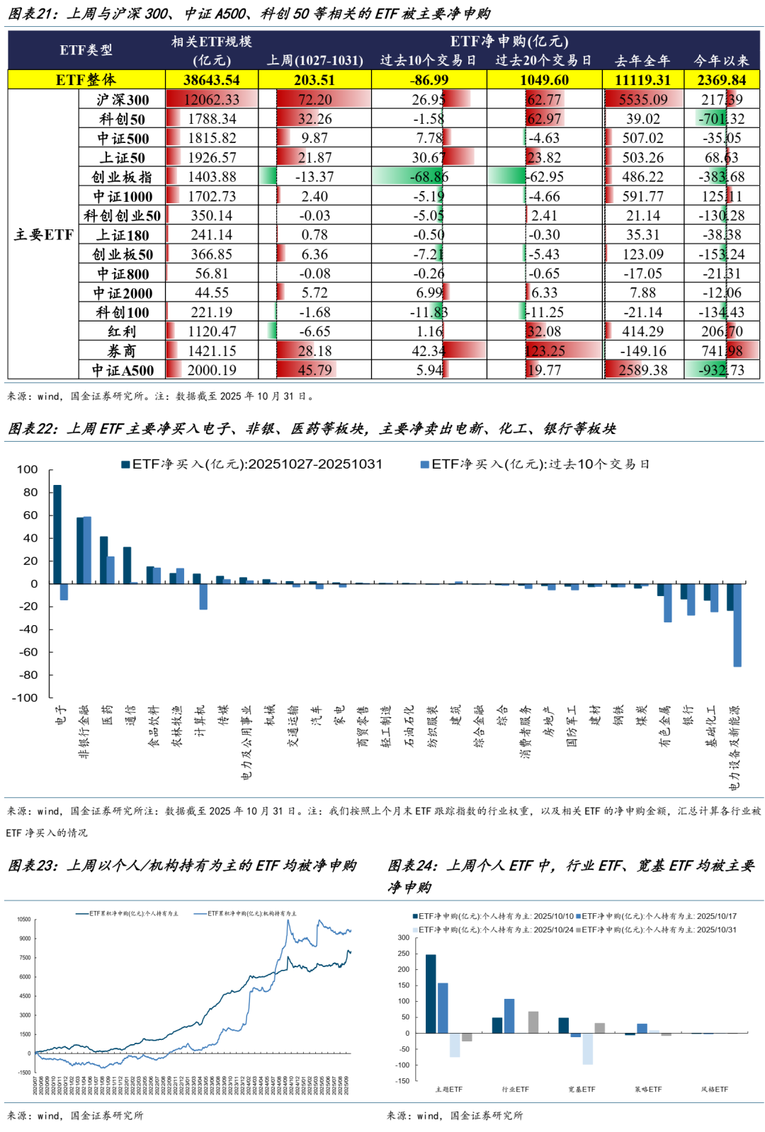 ETF被净申购,且以机构ETF为主。从ETF跟踪的指数来看,沪深300、中证A500、科创50等相关的ETF被主要净申购,与创业板指、红利等相关的ETF被净赎回。从ETF分拆行业来看,ETF主要净买入电子、非银、医药等板块,主要净卖出电新、化工、银行等板块。