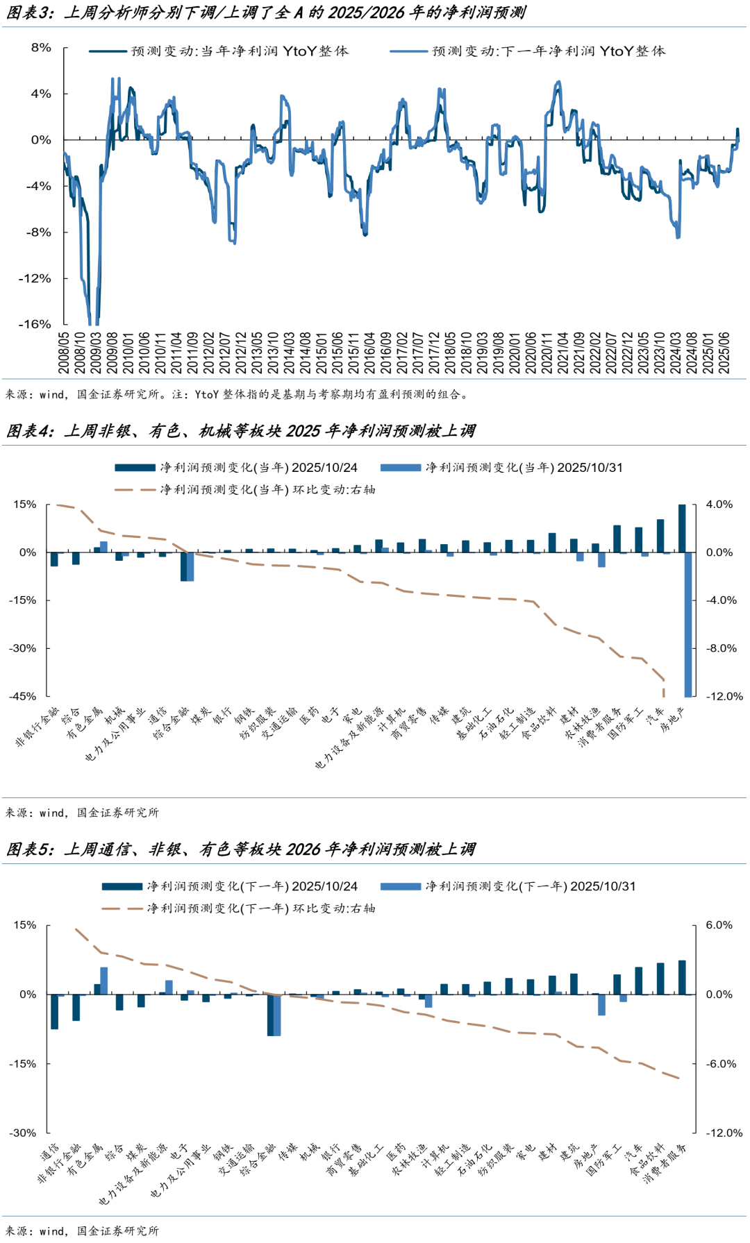 盈利预测:全A的25/26年净利润预测分别被下调/上调。行业上,非银、有色、电力及公用事业、通信等板块25/26年净利润预测均被上调。