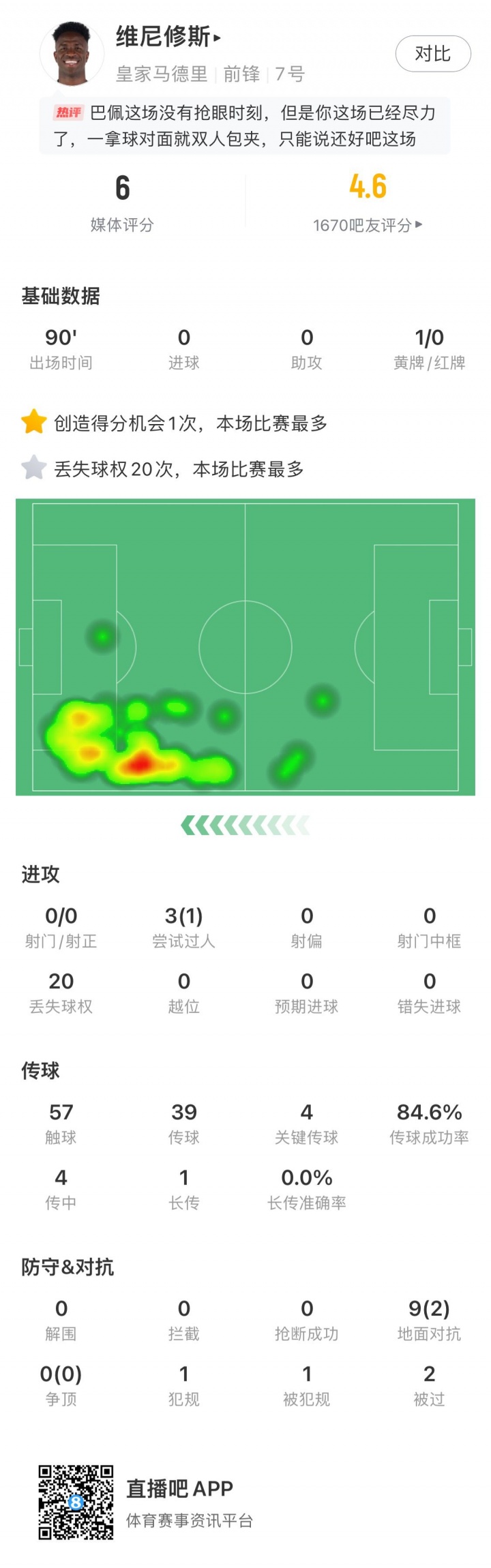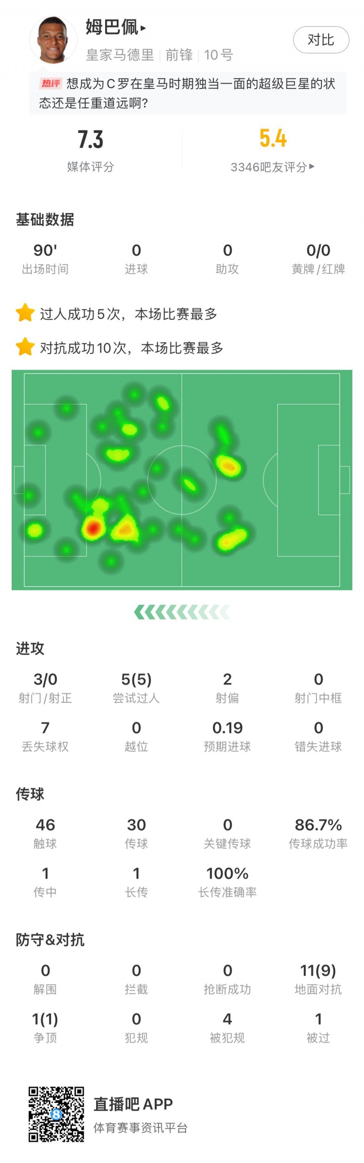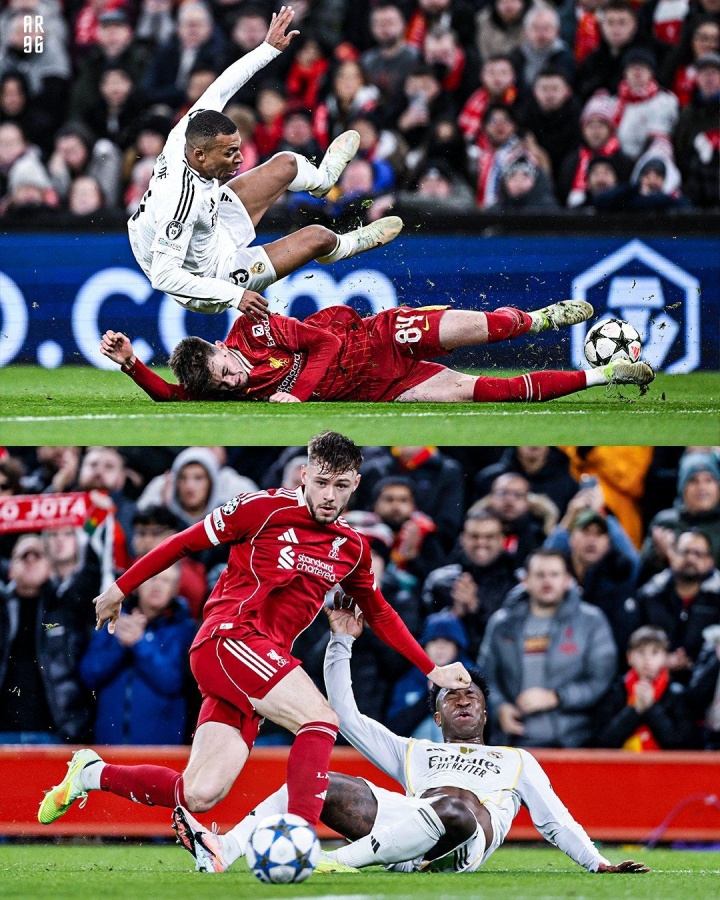 姆巴佩3射0正,0关键传球,10次成功对抗全场最高;维尼修斯本场0次射门,4次关键传球,9次对抗仅2次成功。两人均未能攻破安菲尔德的球门。
