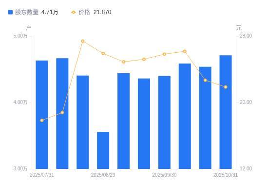 近一年(2024年10月31日至2025年10月31日),博威合金A股股东户数从3.83万户,增加至4.71万户,增幅22.98%,区间股价上涨17.46%。