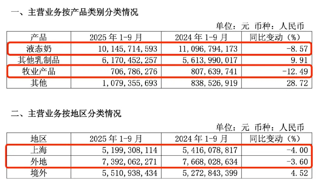 光明乳业同样面临核心产品增长动力不足的困境。从产品结构来看,其支柱业务“液态奶”实现收入101.46亿元,同比下滑8.57%,是拖累整体营收表现的主因。此外,“牧业产品”收入虽规模相对较小,为7.07亿元,但同比也下降12.49%,进一步加剧了整体营收压力。从地区表现看,其大本营上海市场与外地市场双双下滑,分别为4.00%和3.60%,表明其在国内市场面临全面承压。