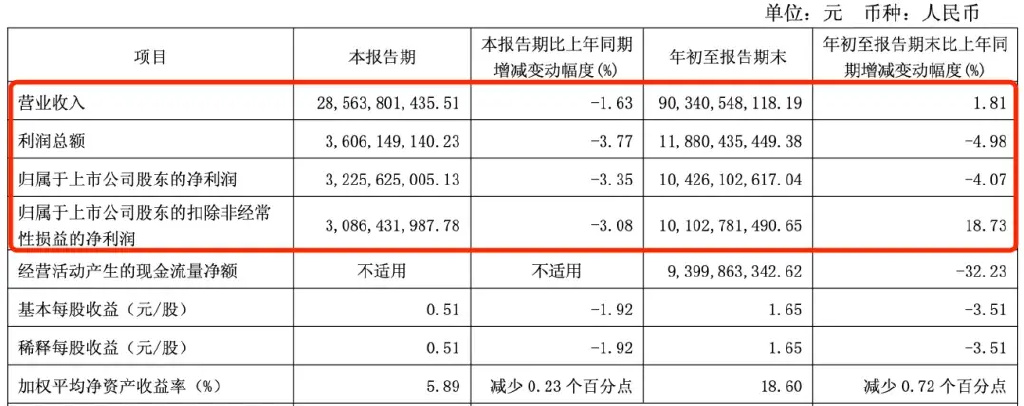 伊利股份作为行业龙头,在报告期内呈现出“增收不增利”的经营状况:总营收905.64亿元,同比增长1.71%;归母净利润104.26亿元,同比减少4.07%。但值得关注的是,其扣非净利润达101.03亿元,同比增长18.73%。这说明伊利的主营业务盈利能力实际上在增强,净利润的短暂波动可能源于非经常性收益的减少。