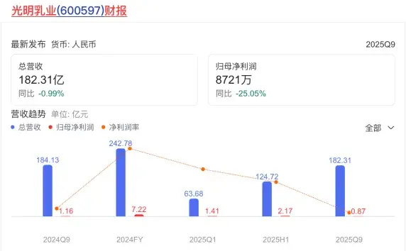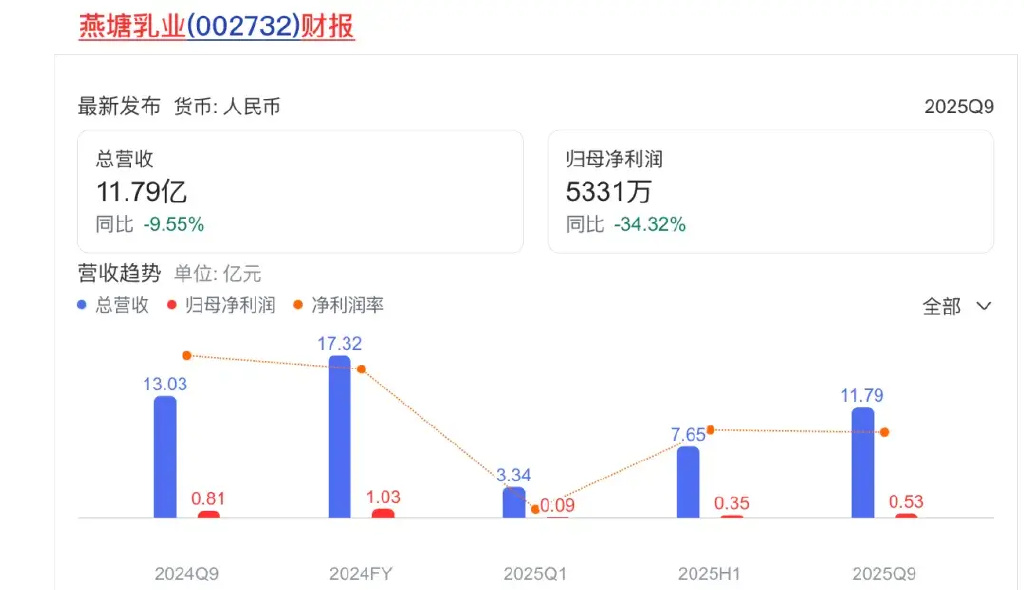 正所谓,几家欢喜几家愁。与前述企业形成鲜明对比的是,有四家乳企陷入了营收与净利润双双下滑的困境。其中,燕塘乳业和光明乳业虽仍保持盈利,但增长动力明显不足:总营收分别为11.79亿元和182.31亿元,同比分别下降9.55%和0.99%;归母净利润分别为5331万元和8721万元,同比降幅分别达到34.32%和25.05%。