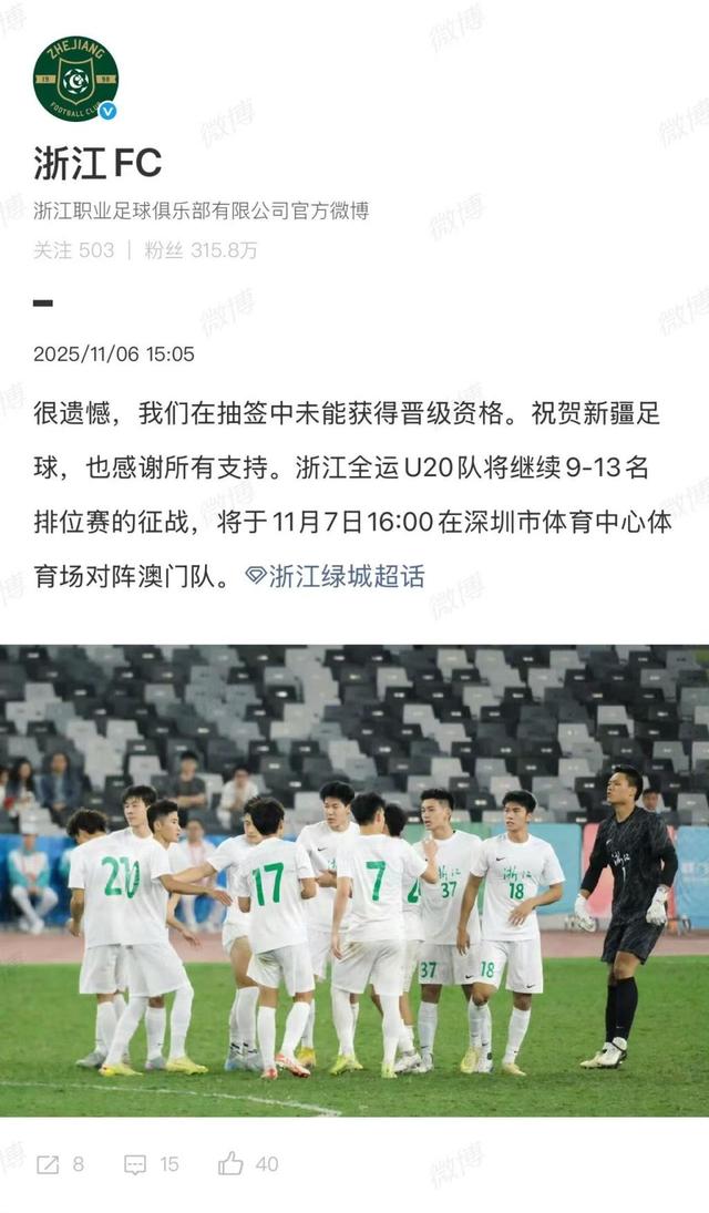在抽签结束后,浙江队通过微博“@浙江FC”表示:很遗憾,我们在抽签中未能获得晋级资格。祝贺新疆足球,也感谢所有支持。浙江全运U20队将继续9-13名排位赛的征战,将于11月7日16:00在深圳市体育中心体育场对阵澳门队。