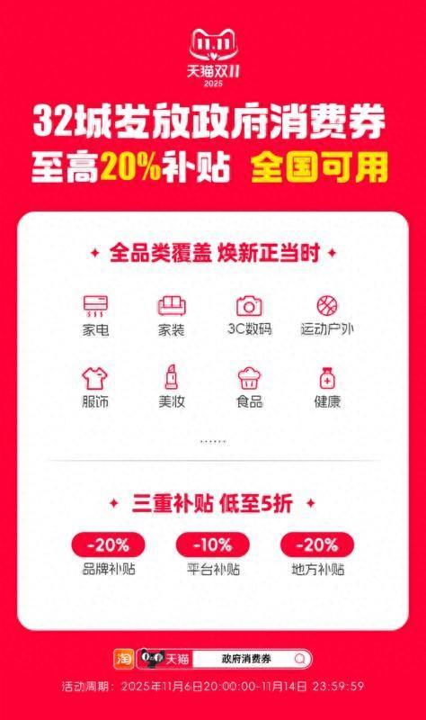 作为全年优惠最大的消费节点,天猫双11再迎重磅加码!记者获悉,11月7日起,杭州等32城率先在淘宝发放政府消费券,加码天猫双11。本轮政府消费券,全国消费者可领可用,单品至高补贴20%,覆盖家电家装、3C数码、运动户外、服饰、美妆、食品等品类,支持与天猫双11优惠叠加,低至5折。通过淘宝APP搜索“政府消费券”即可直达。