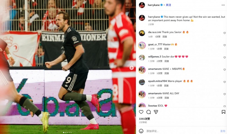 凯恩也在赛后通过社媒晒出自己进球后的庆祝照,并配文:“这支球队永不放弃!没拿到我们想要的胜利,但从客场带走重要一分”。