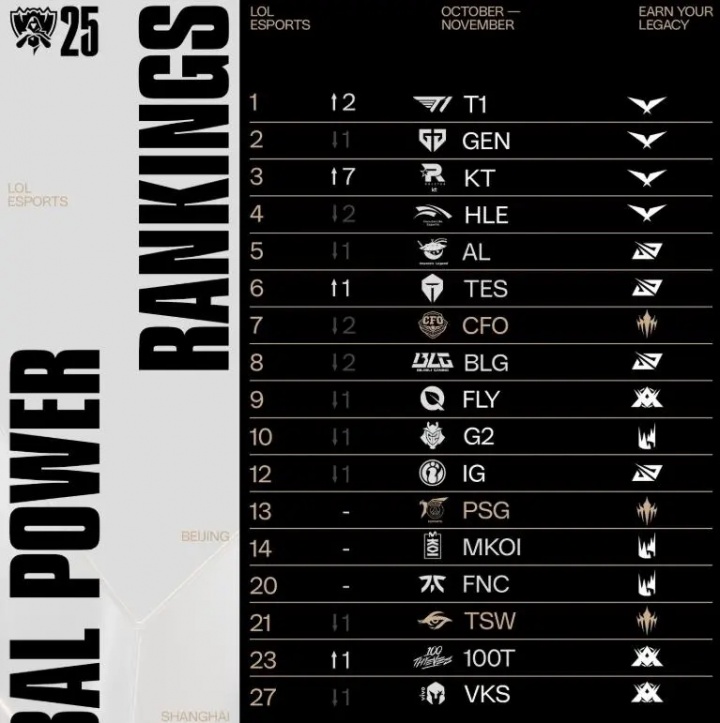LOL战队全球实力榜更新:LCK包揽前四!AL第五,BLG排名不如CFO!