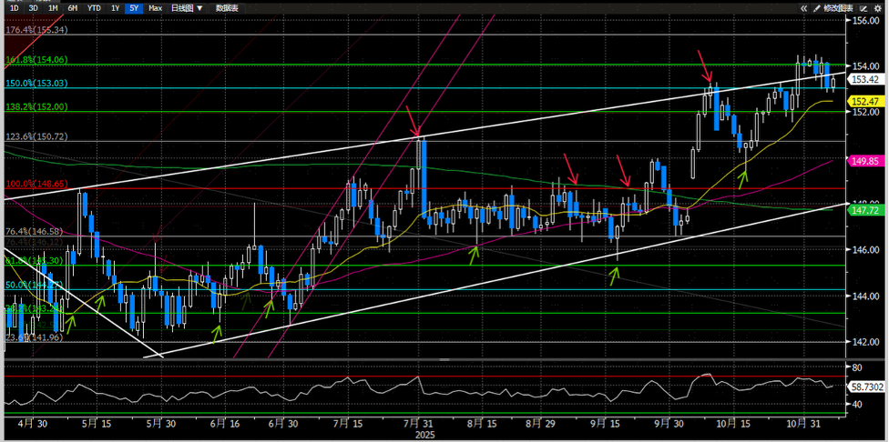 美元/日元上周如期走出冲高回落行情:美元多头上涨至1.618%斐波那契延伸位154附近遇阻后有所回落,但在10月中旬前高153附近找到支撑后,在周内维持高位小幅震荡走势。向前看,如果美元多头无法成功突破上周周内高点154这一关键位置,那么美元/日元回落至21天均线152.50附近的概率则会大增,而这里也是本周多空双方争夺的关键,如果美元多头再次失守,那么价格继续回落的概率则会大增。我们认为美元/日元本周可能会走出高位震荡的行情。