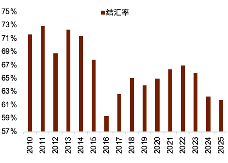 今年外汇市场供求改善,“待结汇”资金或偏缓释放随着今年来人民币升值趋势愈加明显,净结汇规模整体增加。2022年由于中美利差转入深度倒挂,越来越多的企业倾向于持有外币,出现“资产外币化,负债本币化”的情形。这直接体现为中国的跨境资金流出有所增加,结汇率走低,这样的压力在2024年尤为明显。今年以来,随着美元走弱、关税压力减轻和中美利差修复,人民币汇率在二季度后转而进入升值通道。在此行情下,外资倾向于增持人民币资产,银行代客净结汇水平与结汇率上行,外汇市场供求整体改善。目前,我们认为往年“待结汇资金”规模的释放程度有限。今年银行代客净结汇规模逐级抬升,结汇率亦较2024年水平恢复明显,不过仍明显低于2018年至2021年的水平(图表6)。一个主要原因或是今年人民币汇率的升值水平仍显温和,与中美利差幅度相差不大,市场主体未出现趋势性交易行情。这亦体现在人民币汇率的隐含波动上,年内整体震荡走低,显示温和升值仍是市场较为稳固的预期。