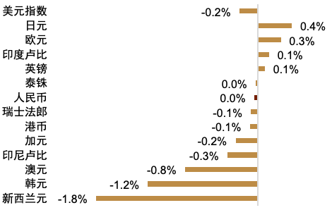 非美货币上周表现不一:市场风险偏好上周大幅走低,这也使得日元表现突出,上周日元最终收涨0.37%领涨G10;而澳元和新元则大幅收跌0.79%和1.76%在G10货币中垫底,其中,澳大利亚央行上周初如期维持利率不变[1],但警告称经济中的通胀压力加剧,并重申未来的政策举措将依据最新数据。欧系货币上周在美元整体回落的背景下表现较好,欧元上周小幅收涨0.25%,而英国央行上周以5-4的投票结果如期维持利率不变,而货币政策声明中的措辞变化略微偏鸽,且英国央行下调了短期的通胀预测,英镑最终仅仅小幅收涨0.08%。人民币上周围绕21天均线继续横盘震荡,波动较小。