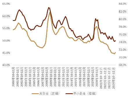 9月实际工资同比下降1.4%根据厚生劳动省6日发布的9月每月劳动统计调查显示[6],剔除物价变动影响后的实际工资同比下降1.4%,连续9个月呈现负增长。代表名义工资的人均现金工资总额增长1.9%,达到29万7145日元,同时反映基本工资水平的固定工资也增长1.9%至26万8653日元。尽管名义工资有所增长,但其增幅仍未能抵消物价上涨的影响。从实际工资持续负增长来看,日本居民的实际购买力仍在逐步下降。我们认为实际工资同比长期为负的主要原因之一在于日本企业的“吝啬”,日本劳动分配率数据(图表13)来看,无论大企业或中小企业,日本企业的劳动收入占比长期呈下降趋势,反映出虽然日本持续涨薪,但是当前工资仍旧相对偏低,企业部门仍需进一步加大涨薪力度。上周,日本最大行业工会UAZensen(涵盖批发零售业、餐饮、纺织等行业)公布了2026年春季劳资谈判的涨薪方针[7],要求为正式员工涨薪6%,为兼职员工时薪涨薪7%,涨薪要求相对“强势”,我们认为在人手不足、劳动分配率较低的背景下日本的涨薪趋势或仍旧持续且强劲。