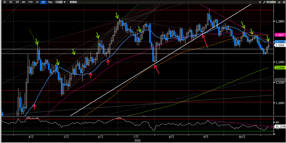 ►欧元上周先跌后涨,继续窄幅震荡,依旧追随美元的走势,前半周延续了此前一周的下行走势一度下跌至1.15下方,而后在欧元区10月PMI终值数据确认经济复苏以及美国就业数据不及预期后,市场对美联储降息预期逐步走高,欧元收复了周初的跌幅,欧元也自周内低点1.1480附近再次走高至1.16附近。欧元最终在上周周内小幅收涨0.25%左右。
