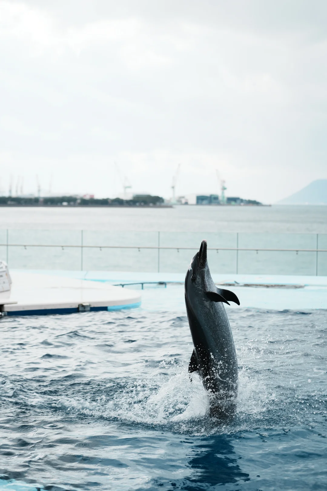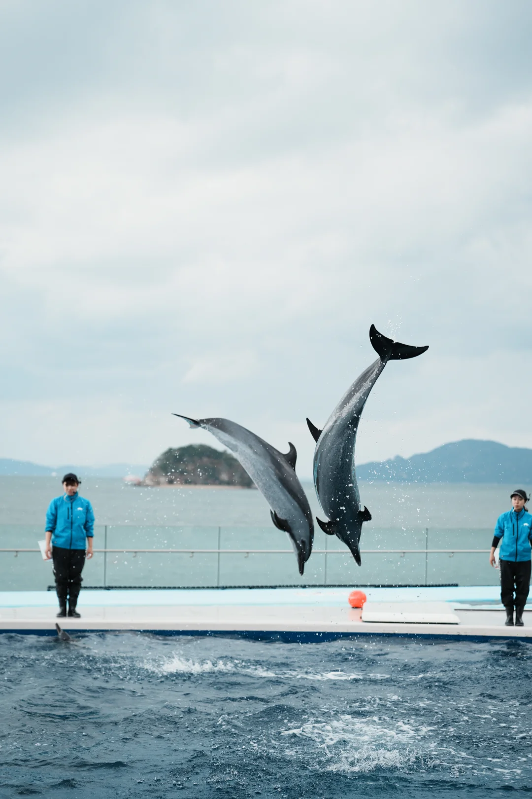 四国水族馆海豚池以濑户内海为背景,为游客提供绝佳的生态欣赏体验。饲养员会在海豚池边讲解太平洋斑海豚的知识。