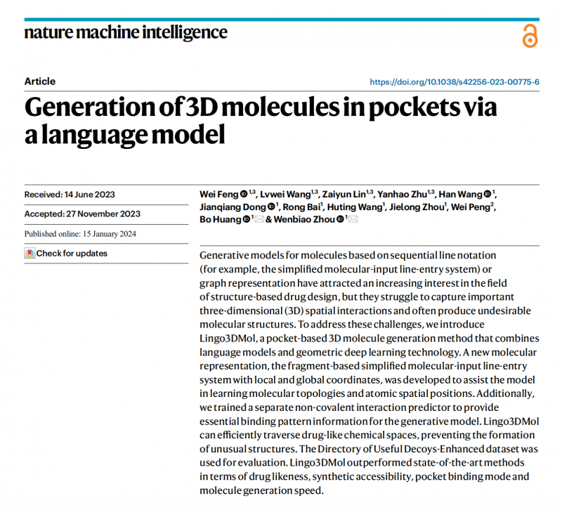 2024年,望石智慧在《NatureMachineIntelligence》发表重磅研究成果,正式推出Lingo3DMol。