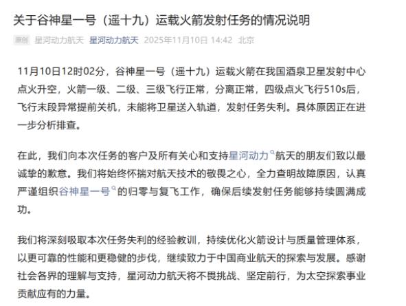 火箭在酒泉发射失败,中国星河动力航空公开致歉:任务失利! 11月10日中午,位于酒泉卫星发射中心的一次商业发射未能如期完成。星河动力航天的谷神星一号(遥十九)运载火箭在12:02点火升空,前三级飞行与各级分离过程均正常,但四级在点火约510秒后出现末段异常、提前关机,未能把两颗光学遥感卫星和一颗高校科研验证星送入预定轨道,发射失利。 星河动力随后发布说明并公开致歉,表示将全力查明故障原因、认真组织归零与复飞工作,并对客户与社会各界表示诚挚歉意。至此,这家企业已执行22次发射任务、取得20次成功。 所以我们既不能因一次失利就否定民营航天的价值,也不能淡化技术问题带来的教训,认真进行发射失利的经验总结。 谷神星一号是星河动力的主打轻小型固体运载火箭,采用四级混合动力(前三级固体、四级液体上面级),直径约1.4米、全长约20米、起飞重量约33吨,向500公里太阳同步轨道可运约300公斤有效载荷。 该公司自成立以来以量产和高密度发射著称,是国内商业航天领域的代表性企业之一,获评国家级“专精特新小巨人”、国家高新技术企业及中关村金种子企业。谷神星一号系列定位于为微小卫星提供质优价廉的发射服务,在中国民用航天市场占有重要位置。 从产业发展角度来看,民营航天已并非花架子。过去几年,中国涌现出一批民营运载火箭与发射服务企业,完成了从试验到批量发射的跨越,推动了卫星发射节奏与商业化服务能力的显著提升。星河动力能在短时间内开展20余次成功发射,正是这种商业化、市场化驱动的结果。 中国民营航天的快速崛起,既是国家战略推动的延伸,也是市场需求催生的必然结果。国家在政策、发射场资源、监管标准上给予了支持,使民营企业能够在航天产业链上分工、补短、跑出更多样化商业模式,从低成本发射、卫星总装、到应用端的遥感、通信、物联网服务。 民营企业的存在,降低了入门门槛,激发了资本与技术的投入热情,也让“千颗卫星、万类应用”的愿景更可实现。商业航天推动了卫星制造与应用的生态形成,上游技术进步则带动下游服务创新,这是一条可持续且以市场为导向的发展路径。 为什么国家要大力扶持民用、商业航天?原因有三:第一是战略多元化。军民融合之下,民营力量为国家航天能力提供了补充与弹性,尤其在快速部署、灵活响应与产业规模化方面有天然优势。 第二是产业价值链的放大效应。随着发射成本下降、制造规模化,更多民用卫星和下游应用会进入市场,遥感数据、农业监测、应急响应、智慧城市、物流追踪等,都将成为实际的商业场景,产生可观的经济回报。 第三是对外合作与话语权。拥有成熟的商业发射服务,使中国在全球卫星发射市场上更具竞争力,能吸引国际客户、输出技术与服务,从而提升在全球航天领域的话语权与产业影响力。 商业价值具体体现在四个方面:一,发射服务收费与卫星应用服务带来的直接收益;二,卫星技术标准化后,带动上下游供应链的规模化生产与出口;三,数据商业化,遥感、通信频谱、导航增值服务等可转化为长期订阅式收入;四,关联产业的就业与技术溢出效应,促进科研院校与企业协同创新。 更重要的是,商业航天能把深科技转为普惠性应用,把国家级科研成果转变为可持续的社会生产力。 所以星河此次快速发布失利说明,并承诺尽快查清原因,符合企业对社会责任的基本要求。 星河动力这次发言中反复提到“敬畏航天技术”、“查明故障”、“总结教训”、“复飞准备”,这既是企业的责任表态,也是行业成熟的体现。民营航天不是一条没有失败的直线,而是经过反复试验、纠错、改进,最终把高技术变成普惠能力的长跑。只要把安全放在首位、把质量管理写入企业与行业DNA,中国民用航天的商业化道路就会越走越稳、越走越宽。