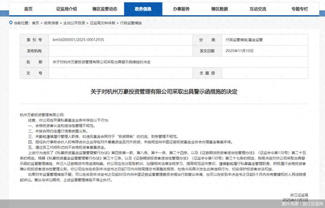 根据有关规定,浙江证监局决定对杭州万豪投资采取出具警示函的监督管理措施,并记入证券期货市场诚信档案。同时,浙江证监局指出,裘至钧作为时任杭州万豪投资法定代表人及总经理、执行董事,未勤勉谨慎履行相关职责与义务,对公司上述问题负有主要责任,违反了相关规定。根据有关规定,浙江证监局决定对裘至钧采取出具警示函的监督管理措施,并记入证券期货市场诚信档案。