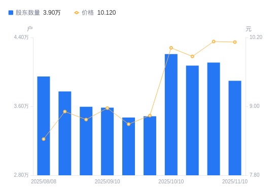 日期A股户数(户)流通A股户均持股数(股)户均持股市值(万元)2025-11-103897015276.8915.462025-10-314108114491.8614.682025-10-204073314615.6714.432025-10-104207314150.1714.182025-09-303485317081.4615.102025-09-193470017156.7814.912025-09-103585816602.7214.892025-08-313595116559.7714.522025-08-203773515776.8714.062025-08-083947415081.8312.71