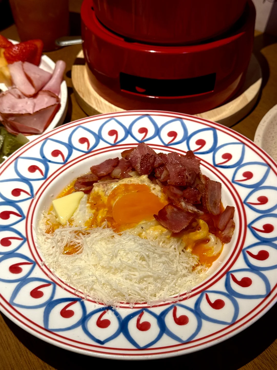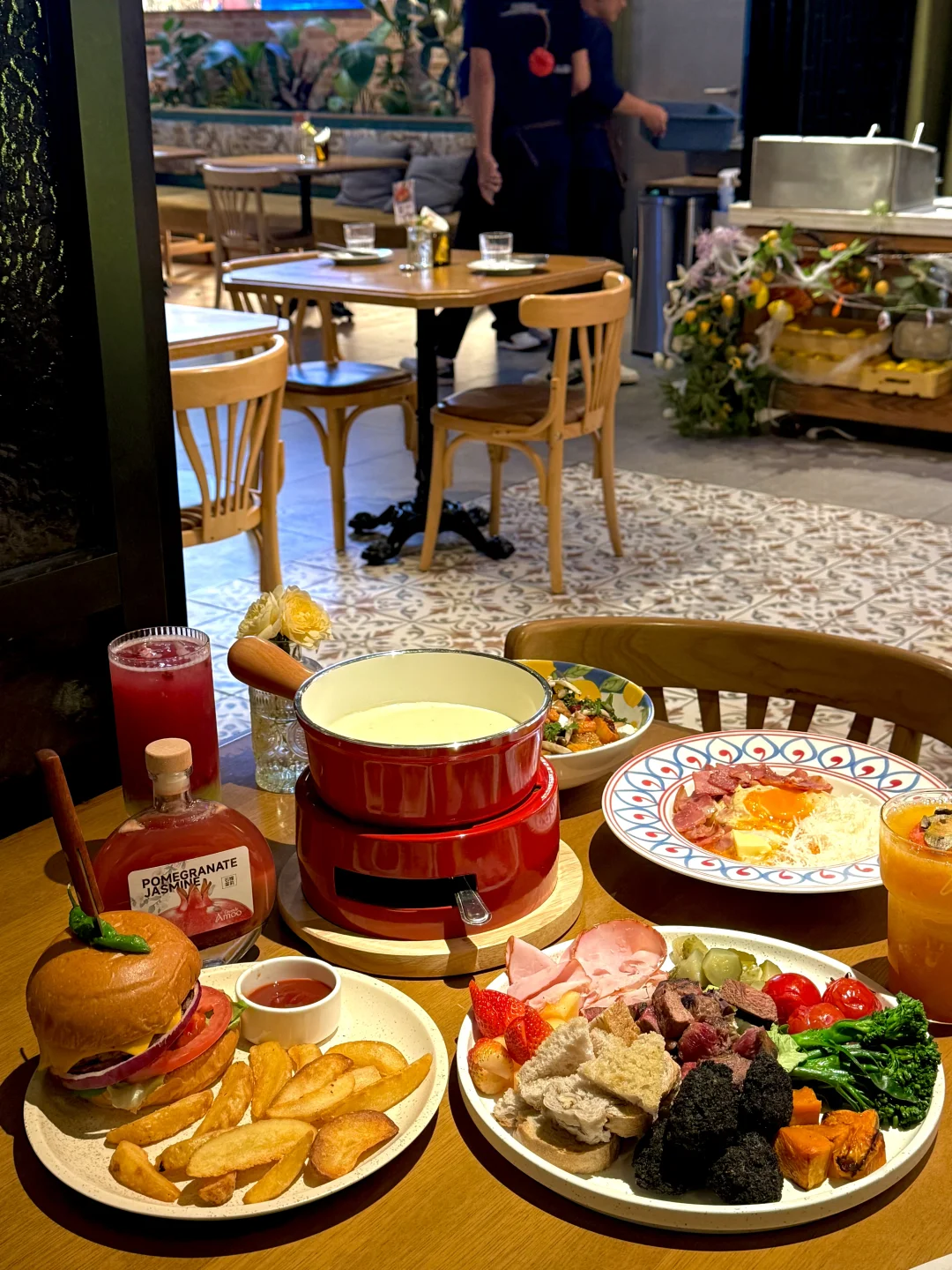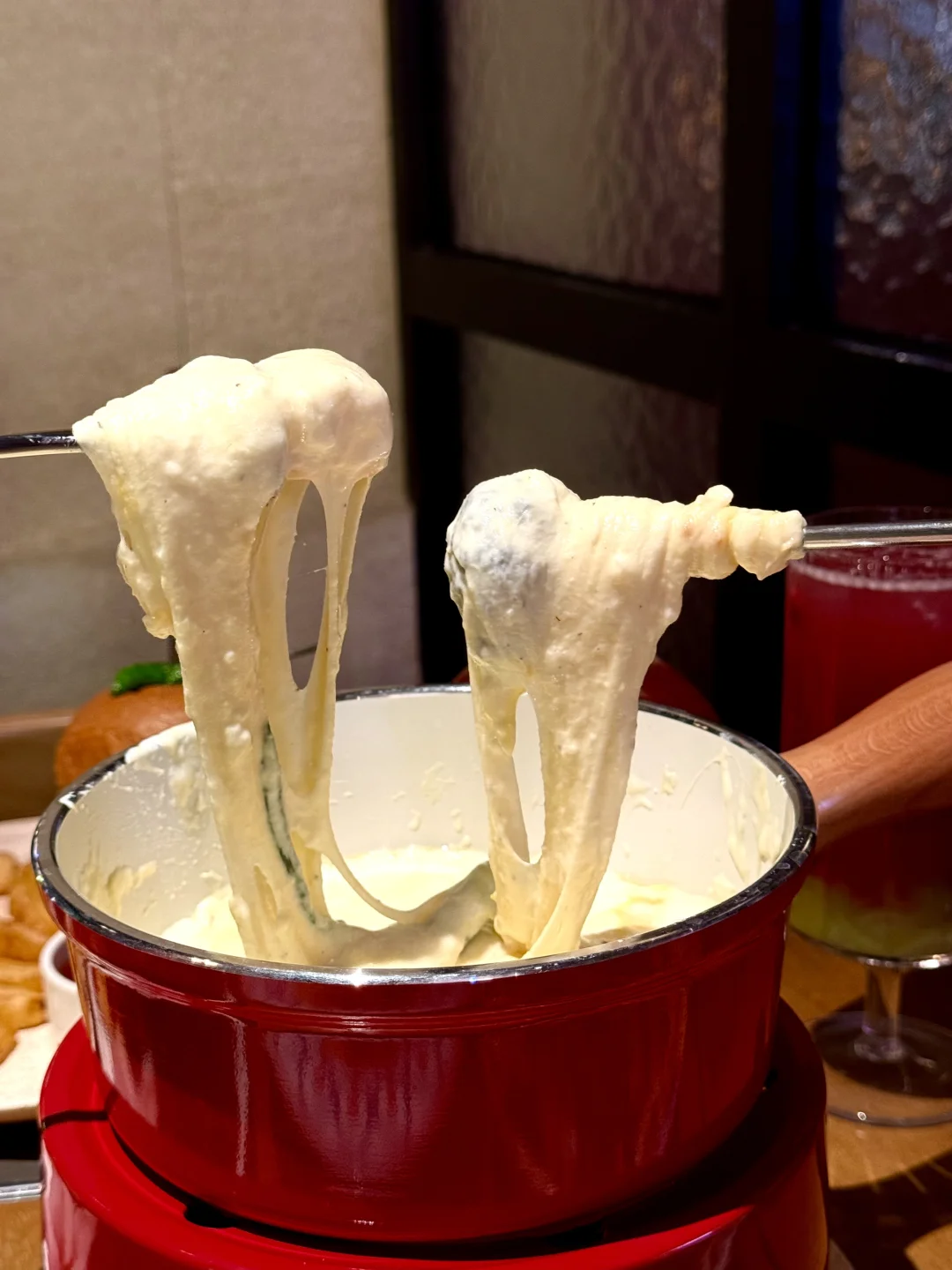 就是冲着它来的💨现场加热的芝士锅奶香奶香的!🧀 还有一大盘配菜,牛排🥩黑金炸鸡🍗火腿片、南瓜🎃烤番茄🍅…用叉子🍴叉起…伸进锅里一卷…这个拉丝真的看得小脑萎缩了!!!吃起来奶fufu!香浓但完全不腻👍🏻