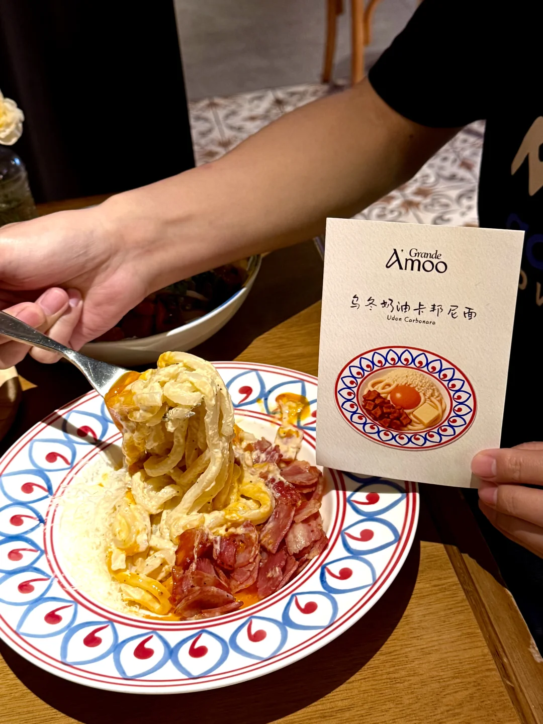 乌冬面裹满丝滑的奶油酱,再和奶酪屑拌在一块儿!这一口真的好顶🆙!乌冬面口感特别有劲道!软糯JI了!