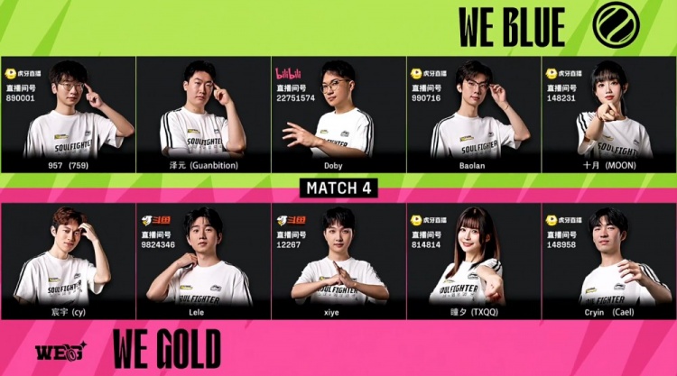 红色方WE金(WEG):宸宇赛恩、Lele婕拉、xiye慧、瞳夕希维尔、Cryin波比
