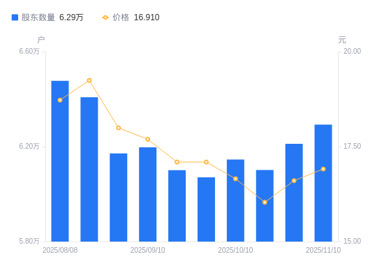 日期A股户数(户)流通A股户均持股数(股)户均持股市值(万元)2025-11-106292610623.5117.962025-10-316212010761.3517.872025-10-206101610956.0617.572025-10-106145810877.2618.112025-09-306070411012.3718.822025-09-196100810957.4918.732025-09-106197410786.7019.092025-08-296171110832.6719.492025-08-206408010432.1920.082025-08-086477110320.9019.32