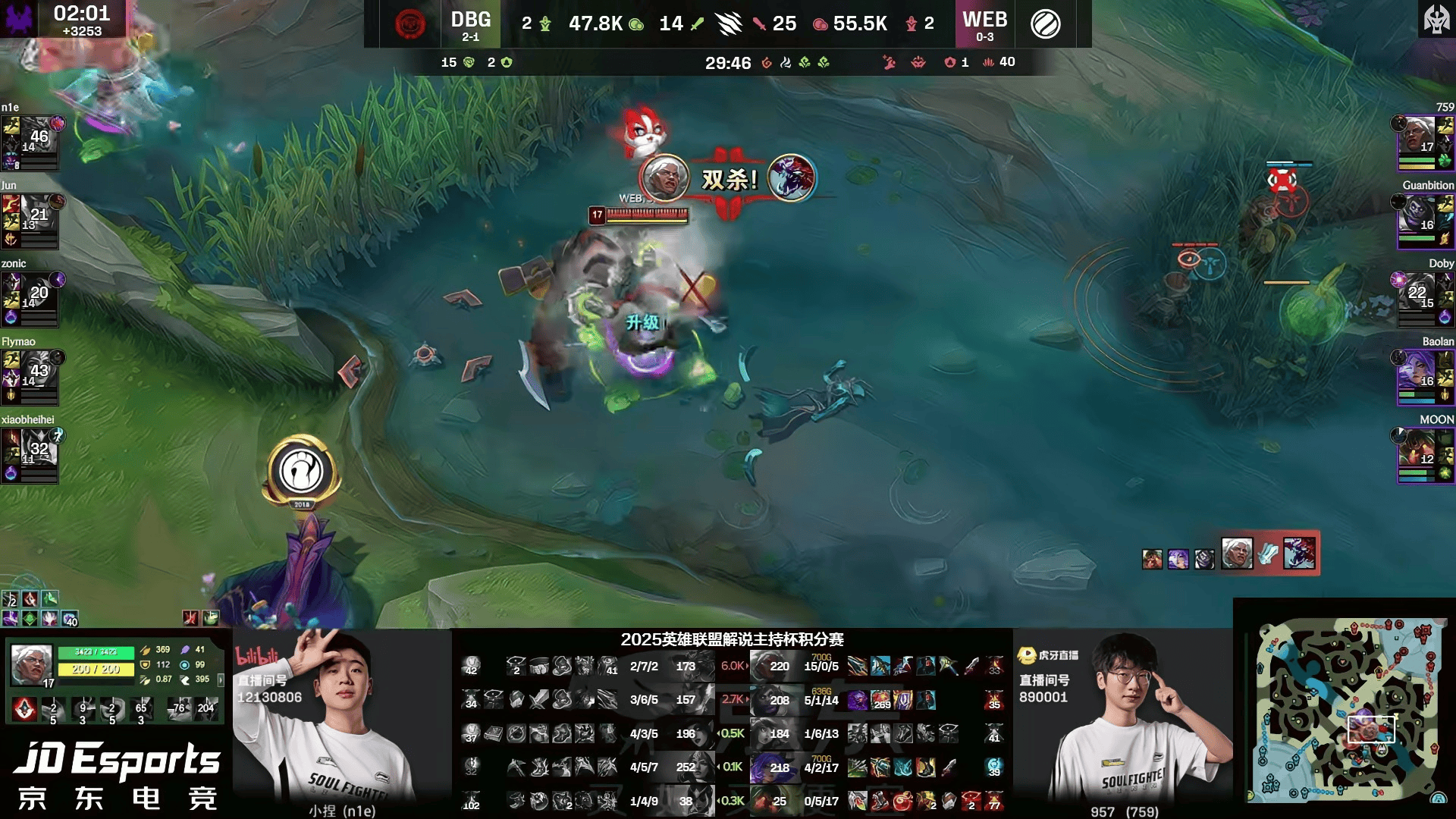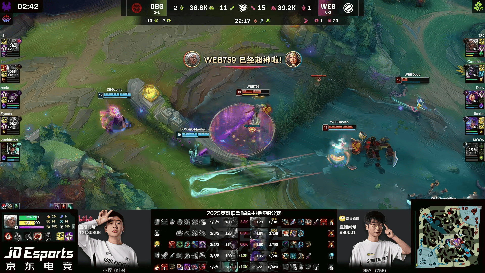 比赛第29分钟,两队爆发远古龙团。957安蓓萨双杀帮助WEB打出0换5团灭DBG。