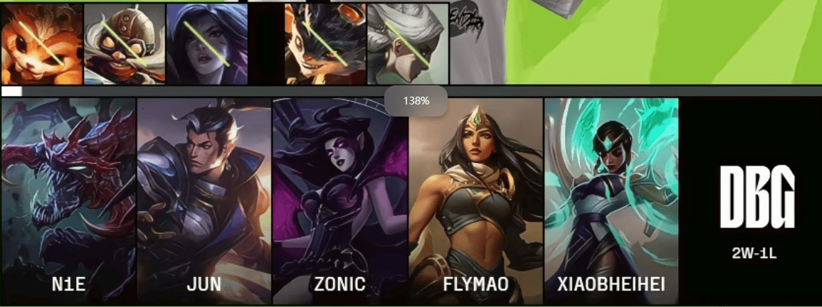 DBG选用:N1e大虫子、Jun赵信、Zonic莫甘娜、Flymao希维尔、Xiaobheihei卡尔玛