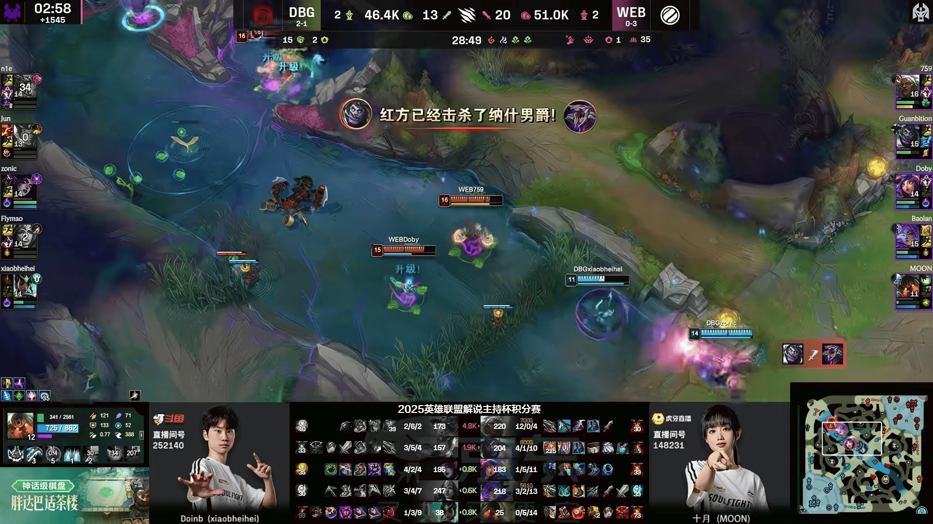 比赛第28分钟,WEB在中路抓到机会击杀DBG赵信和希维尔,随后抱团拿下大龙。