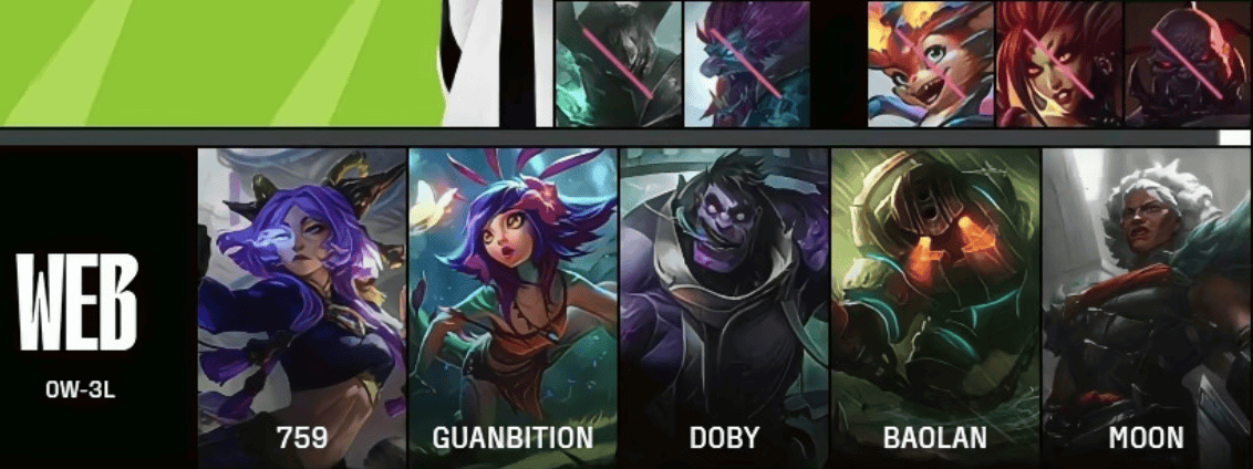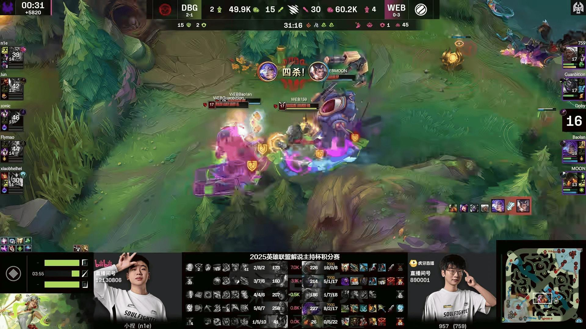 比赛第31分钟,宝蓝芸阿娜四杀帮助WEB打出0换5一波结束比赛,